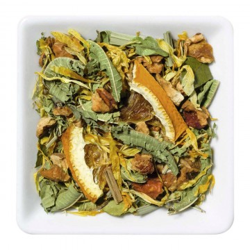 Apfelstücke, Zitrusscheiben, Zitronenverbene, Lemongras, Zitronenmyrte, Ringelblumenblütenblätter.